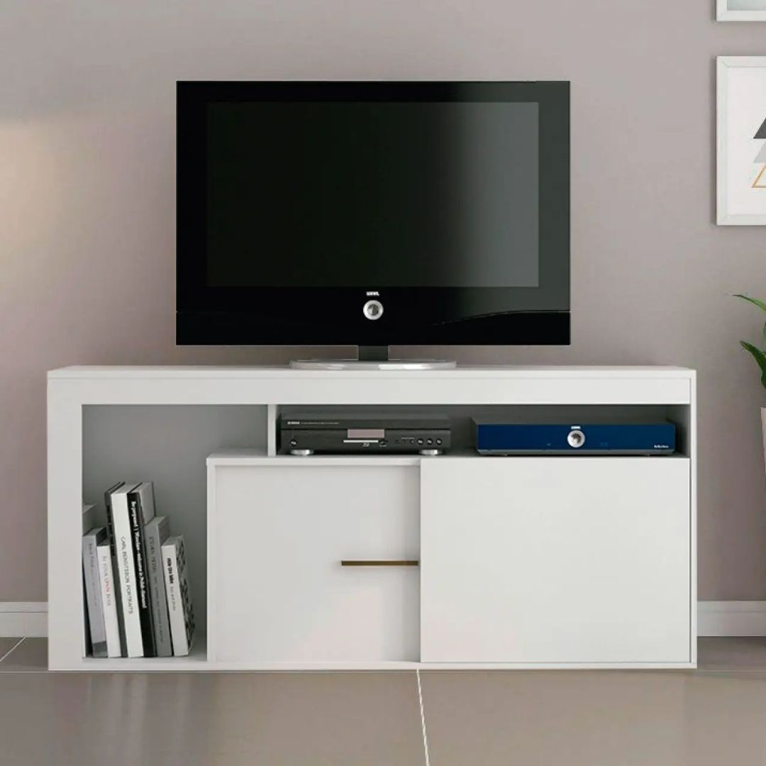 Rack para TV con estante para DVD y consolas, 1 puerta, color blanco.